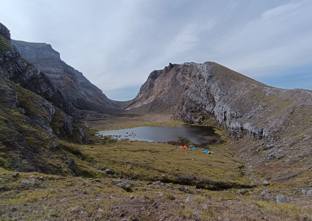 Saat tiba di puncak, Sobat akan menemukan danau musiman berwarna kehijauan yang terbentuk dari kawah bekas letusan.